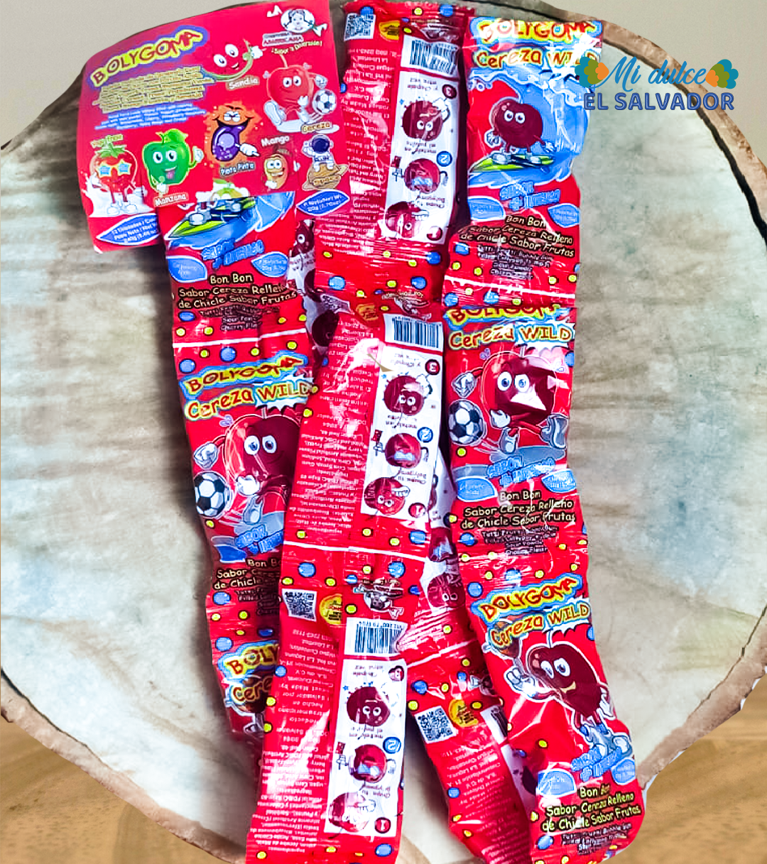 Bonbon relleno de chicle sabor; cereza con polvito acído, 12 unidades por tira.