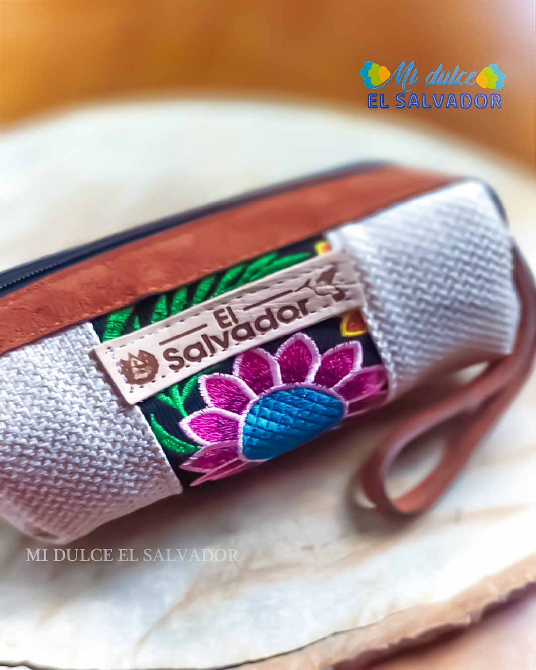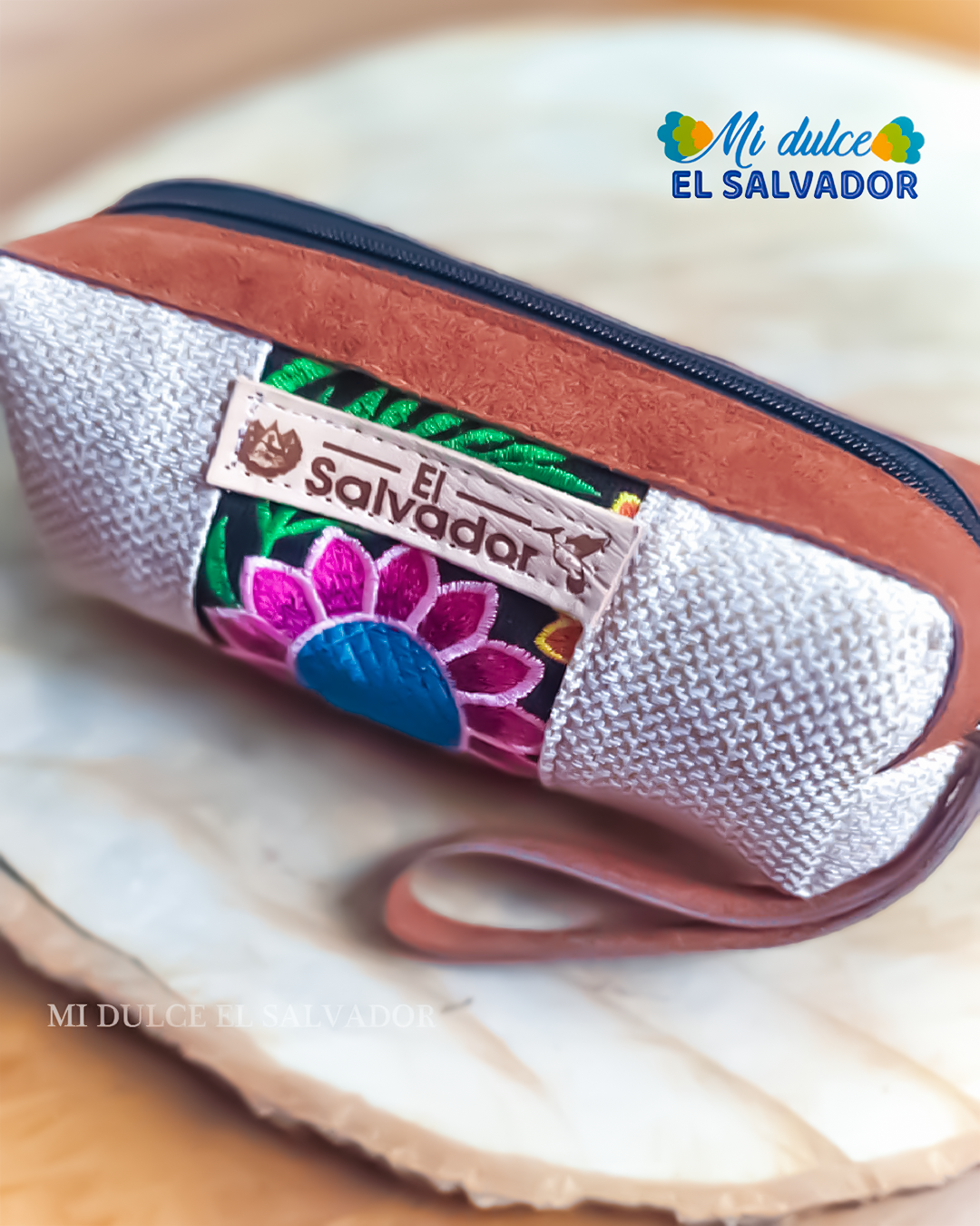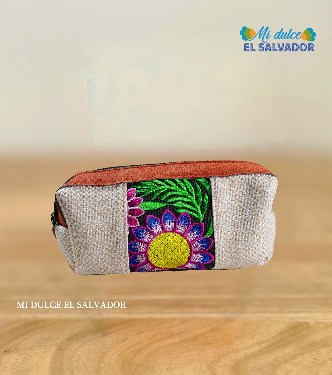 Cosmetiquera café con bordado floral y la frase El Salvador, un accesorio funcional y hermoso que celebra nuestras raíces con estilo y color. 💙🌸