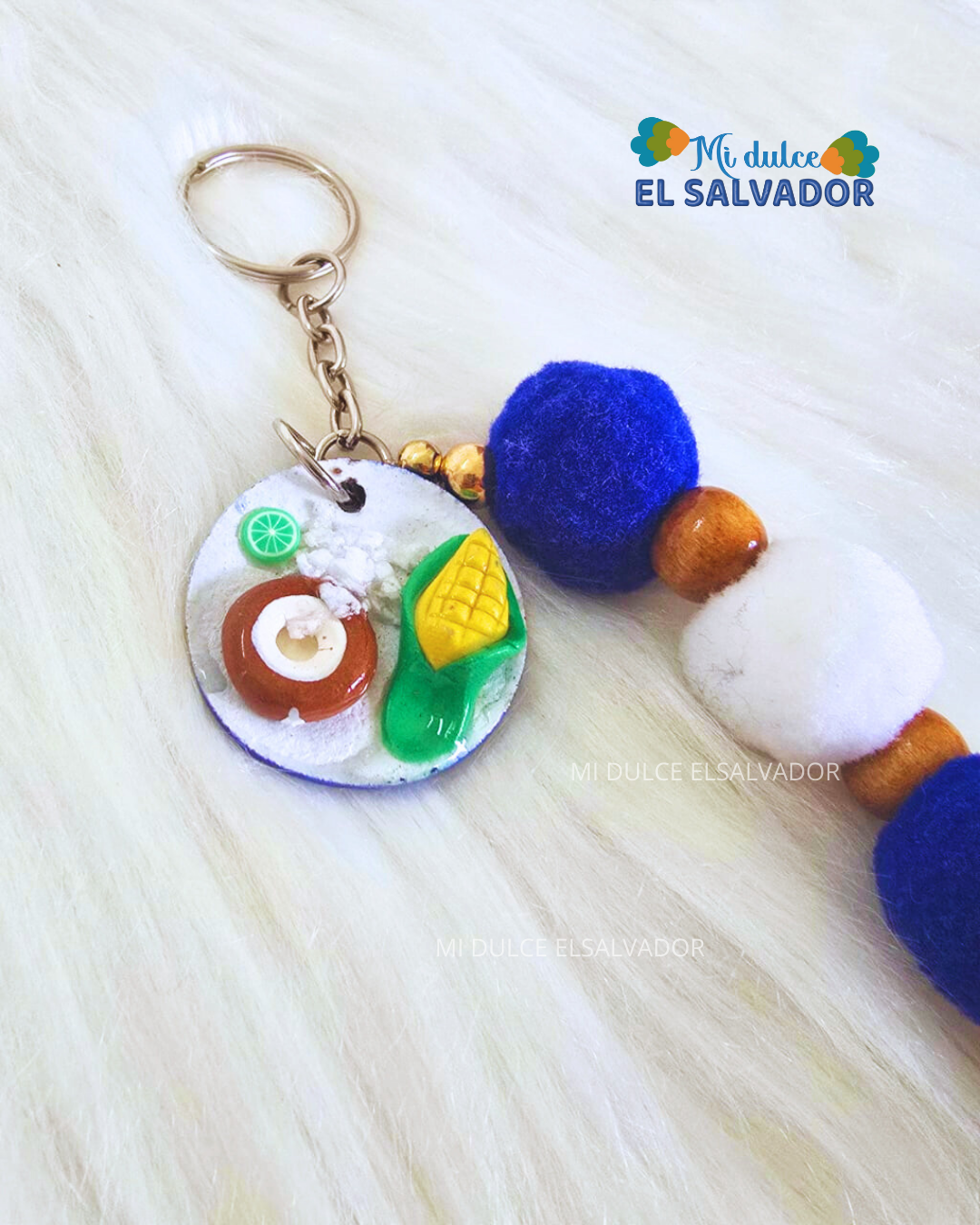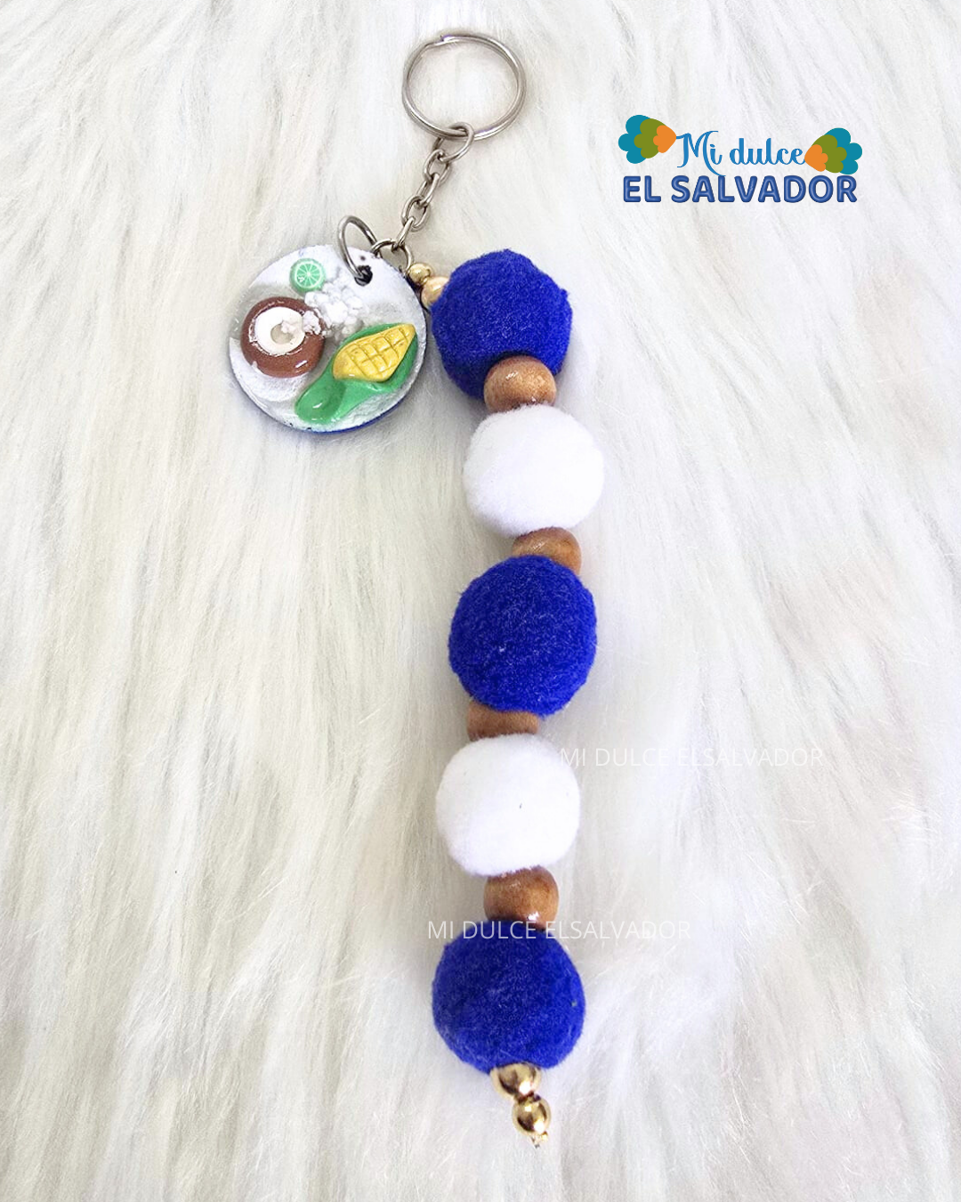 Lindo llavero que representa la cultura salvadoreña de antojitos tipicos y mezcla texturas de pompones tonos azul y blanco, cuencas de madera.