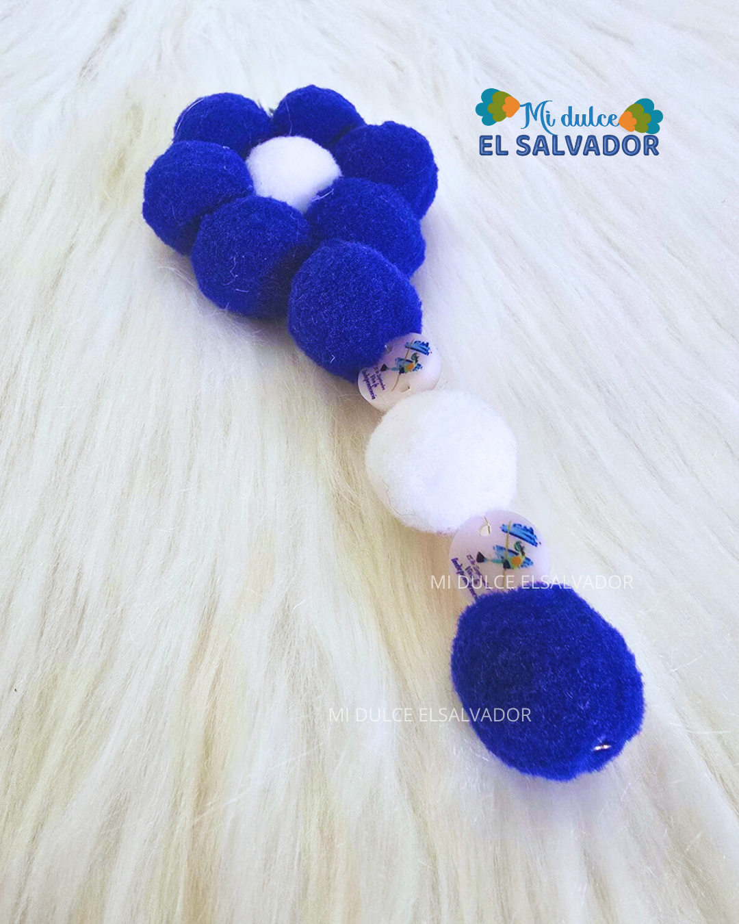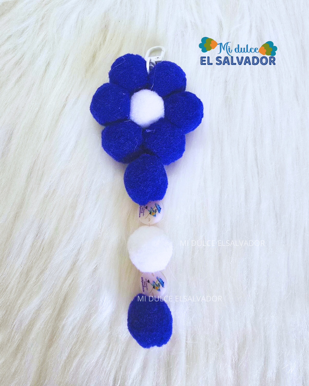 Lindo llavero en forma de flor con pompones mini en tonos azul y blanco, dijes de El Salvador y cuencas de madera.